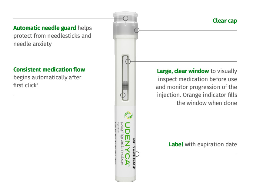 • UDENYCA ONBODY®: 6 mg/0.6 mL in a single-dose prefilled syringe co-packaged with the on-body injector for UDENYCA®.