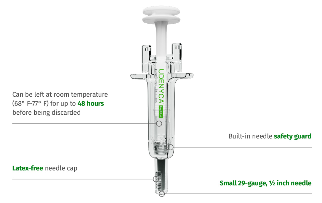 • UDENYCA ONBODY®: 6 mg/0.6 mL in a single-dose prefilled syringe co-packaged with the on-body injector for UDENYCA®.
